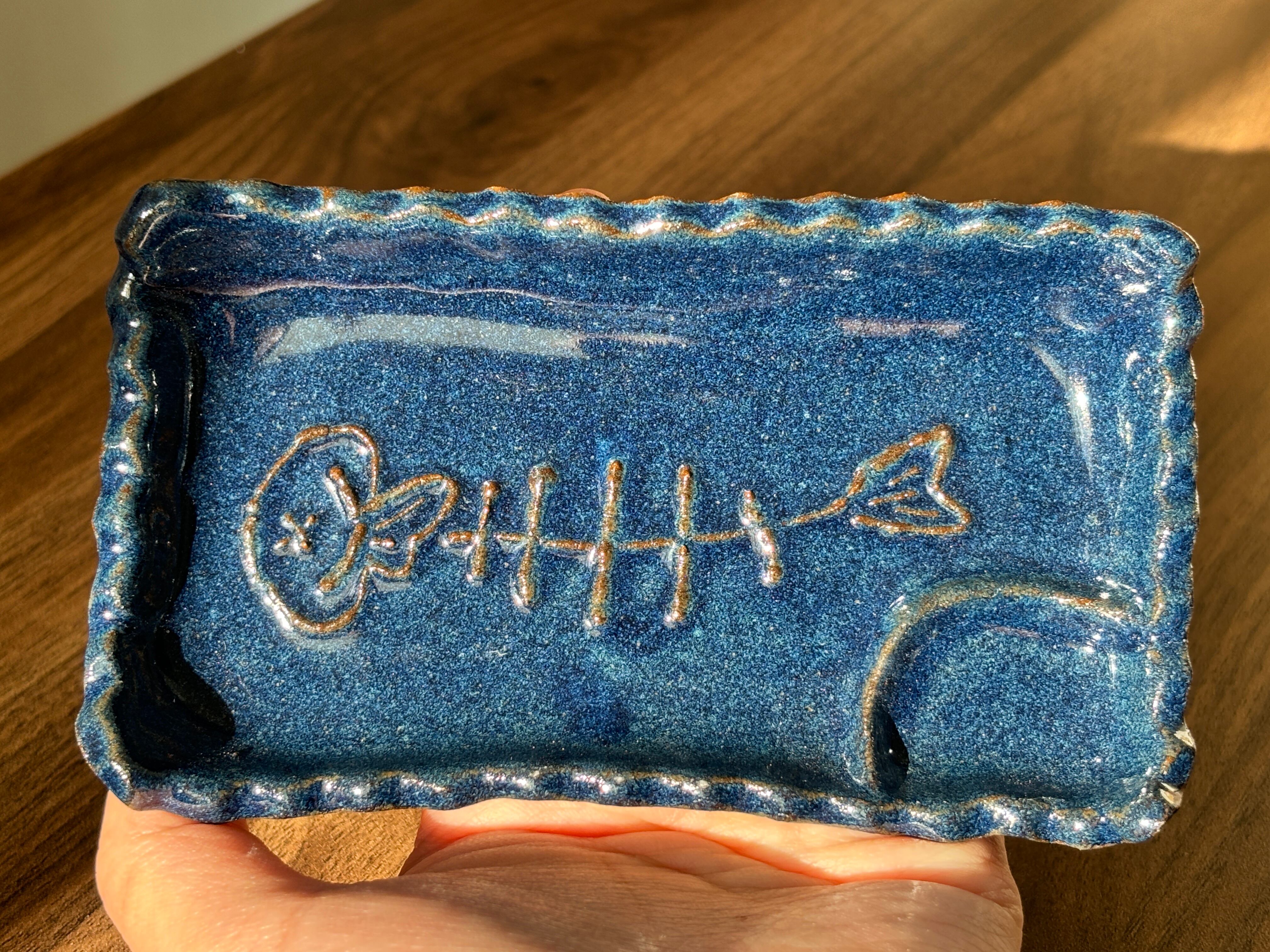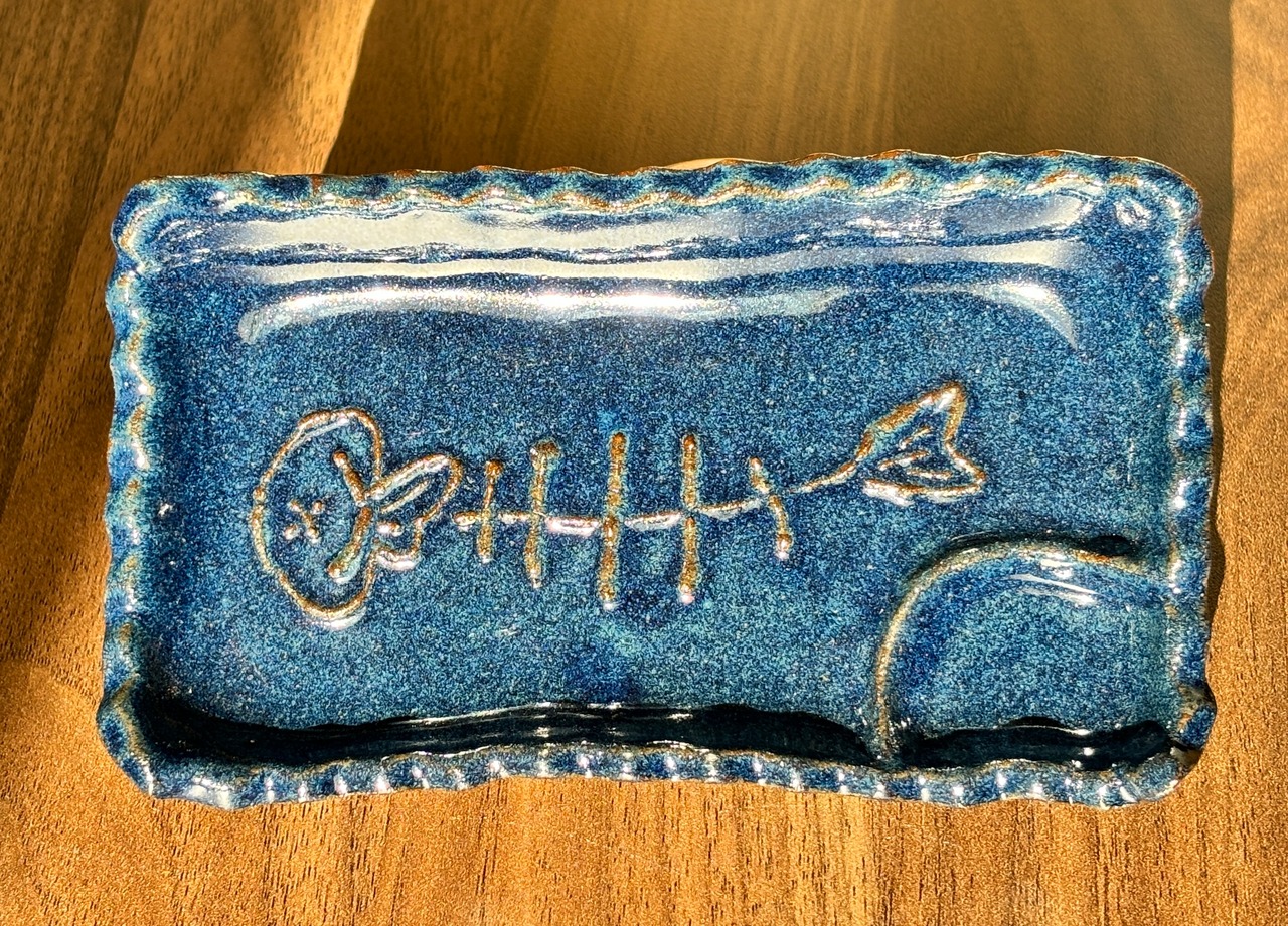 鮮やかな青色の刺身皿は、サカナの骨をモチーフにしたユニークなデザインが特徴です。この皿は、イッチン技術を用いて一つ一つ丁寧に手作りされており、食卓に遊び心を添えます。新鮮なお刺身を引き立てるだけでなく、心に楽しいひとときをもたらす素敵なアイテムとしてご活用ください。