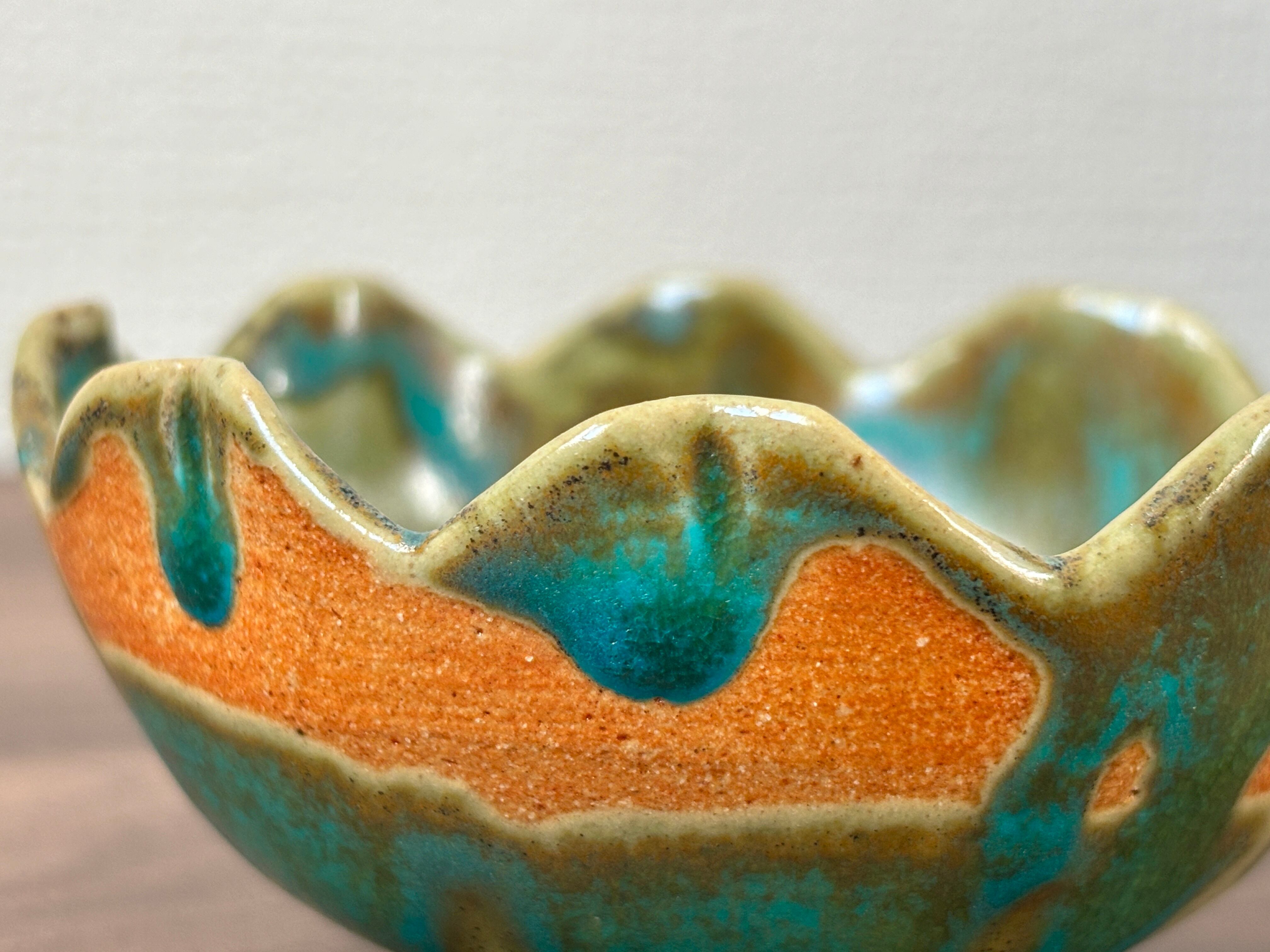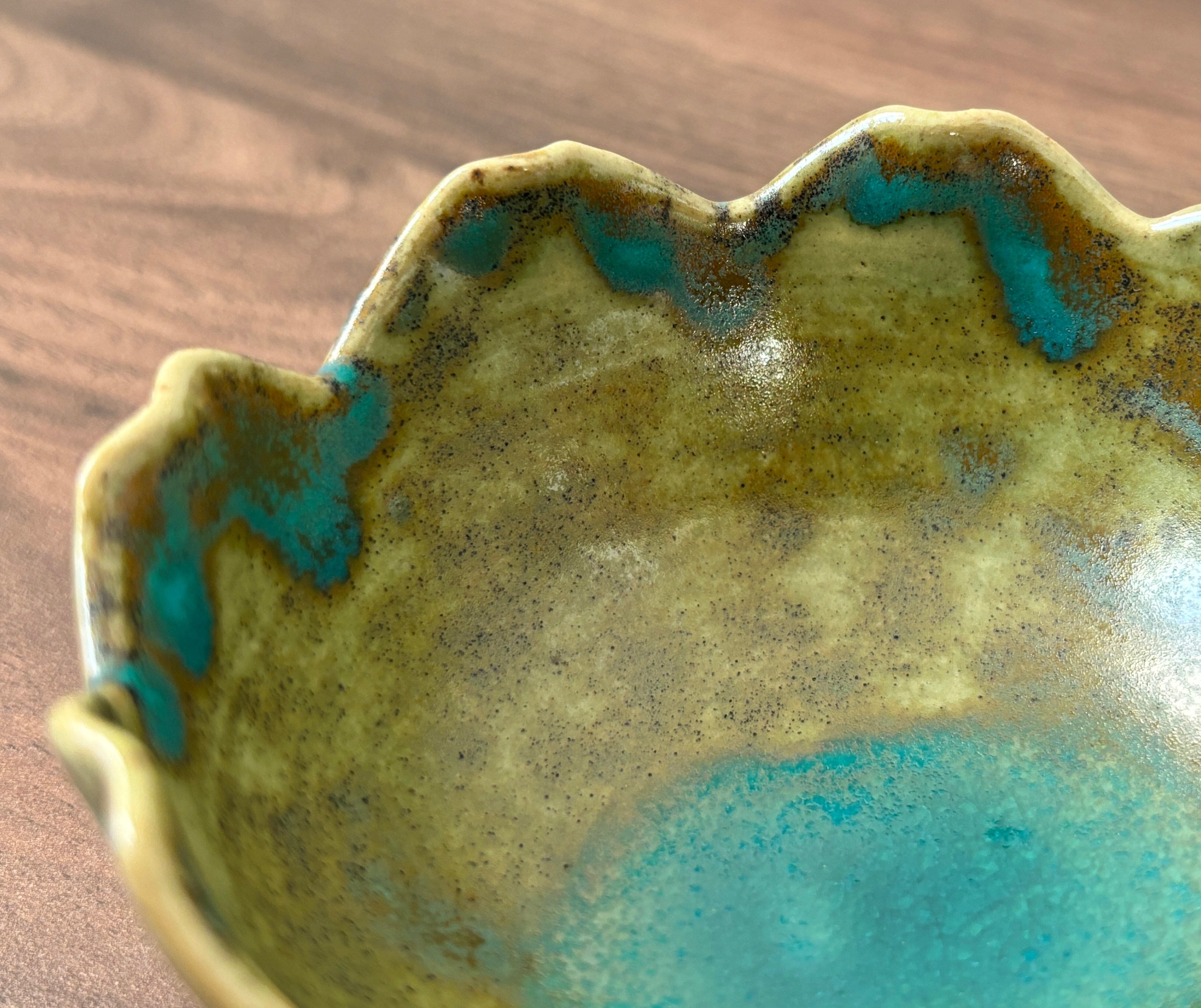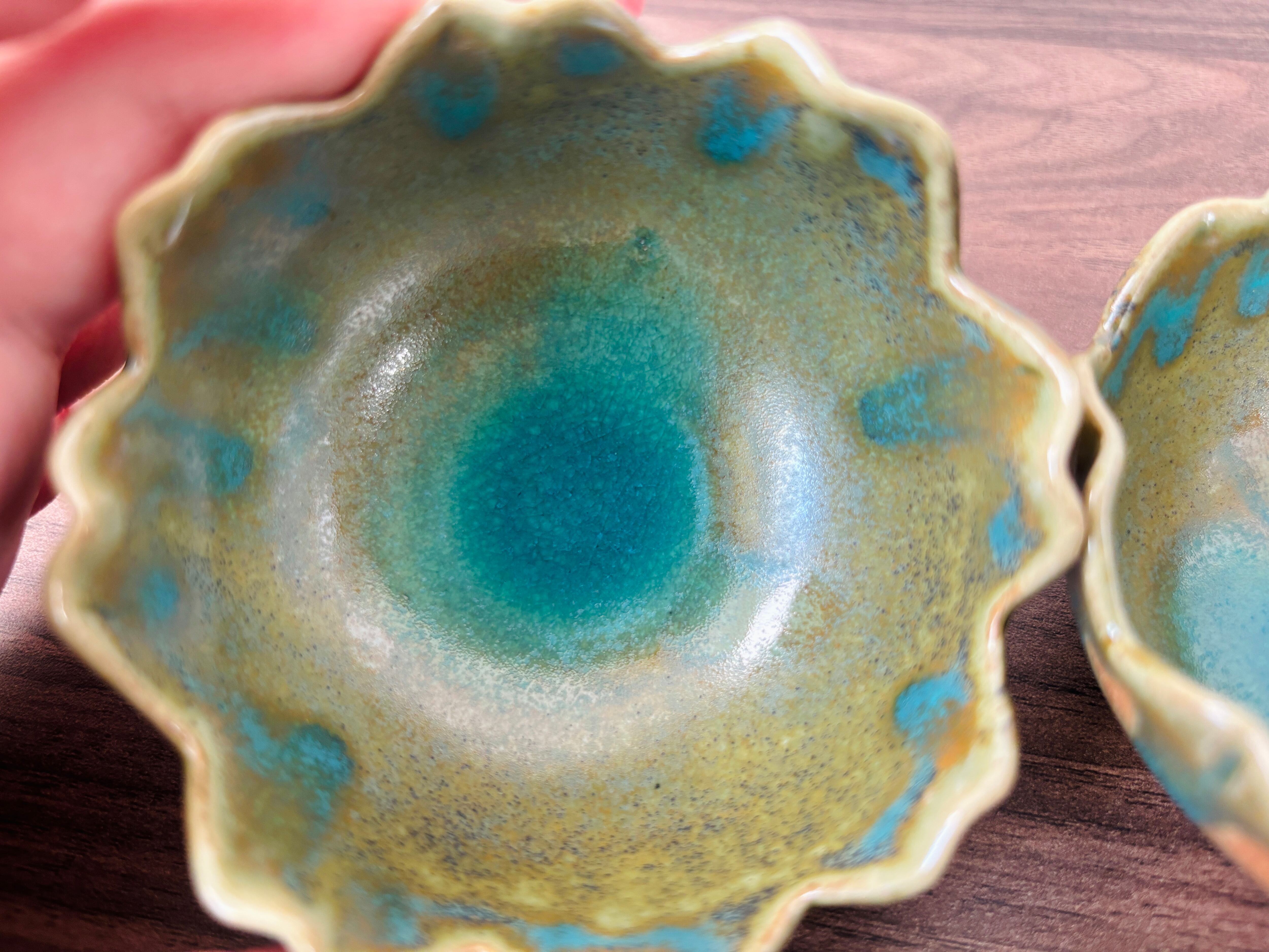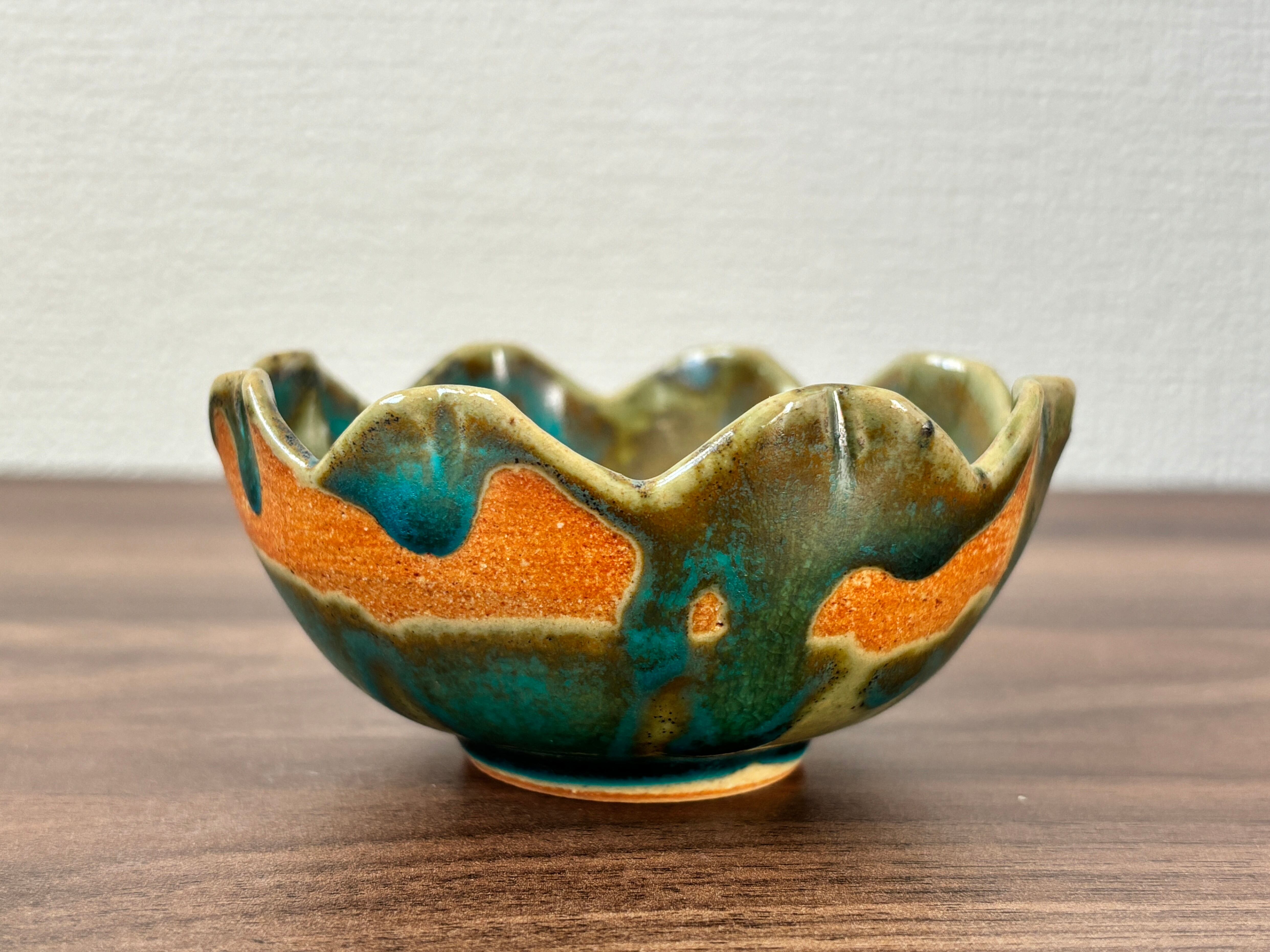 美しい青色の小鉢は、印象的な表情で魅了するアイテムです。小鉢を上から見ると花のように見えます。一点一点で表情が全く違うこの小鉢は、食卓を華やかに彩ります。