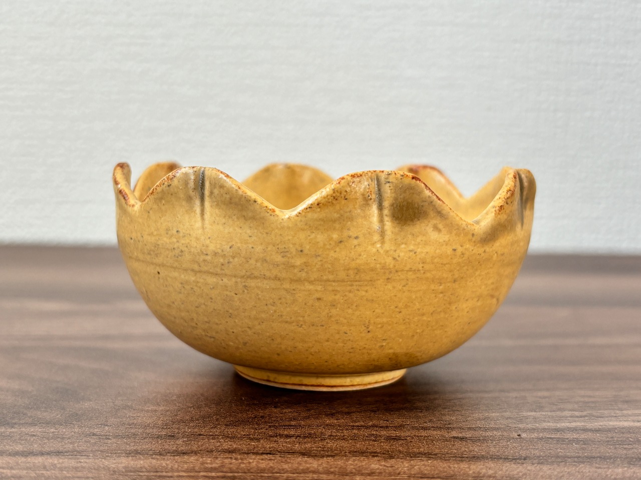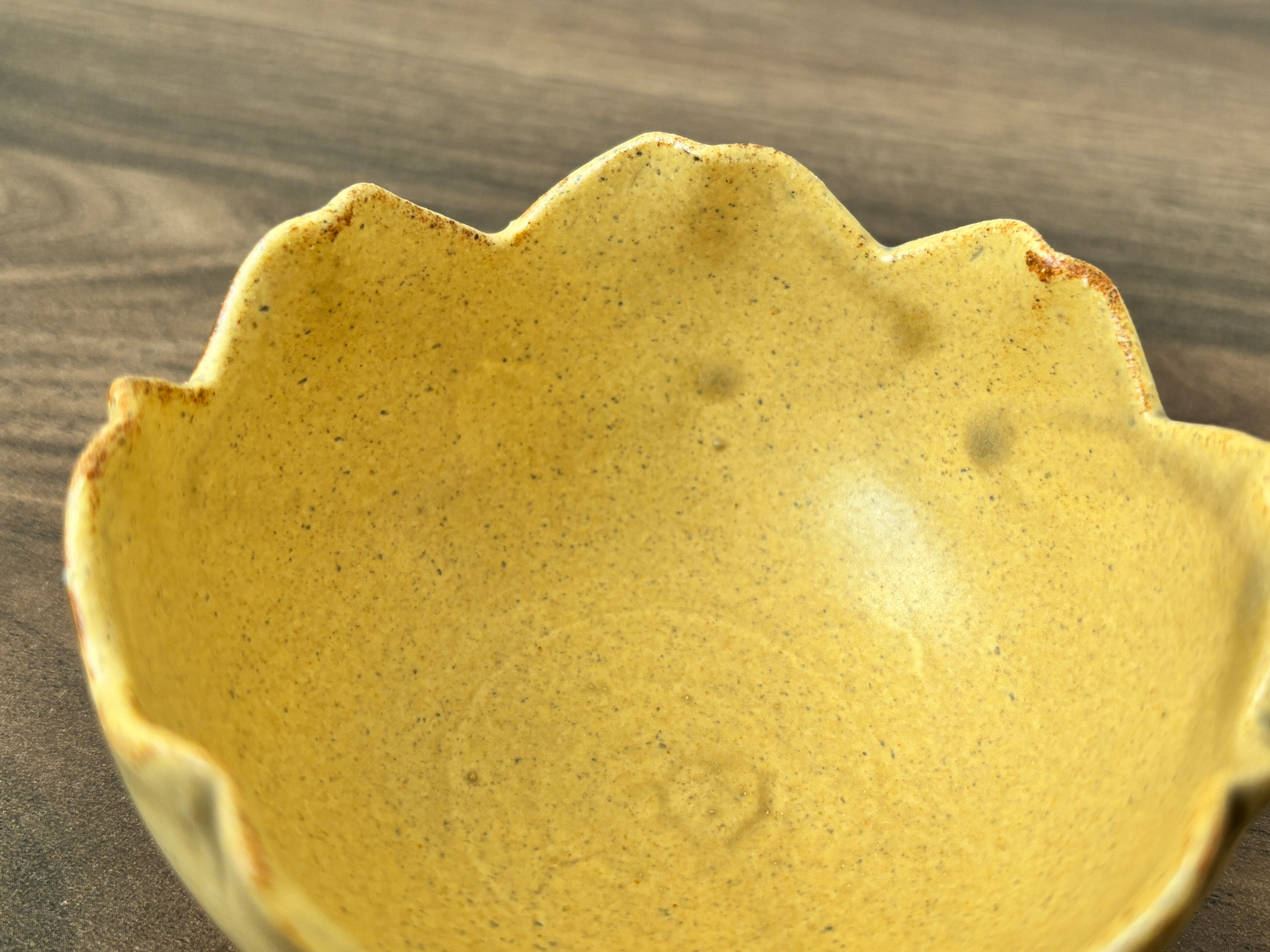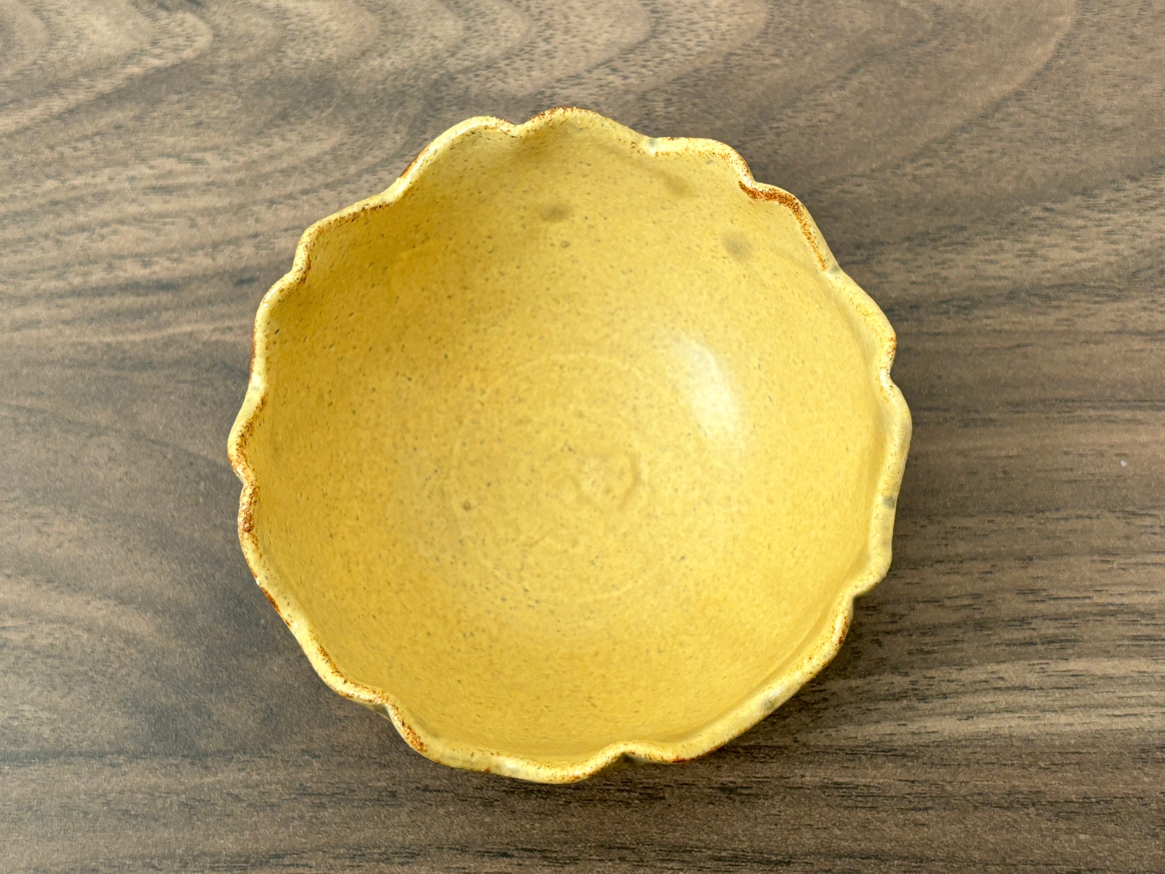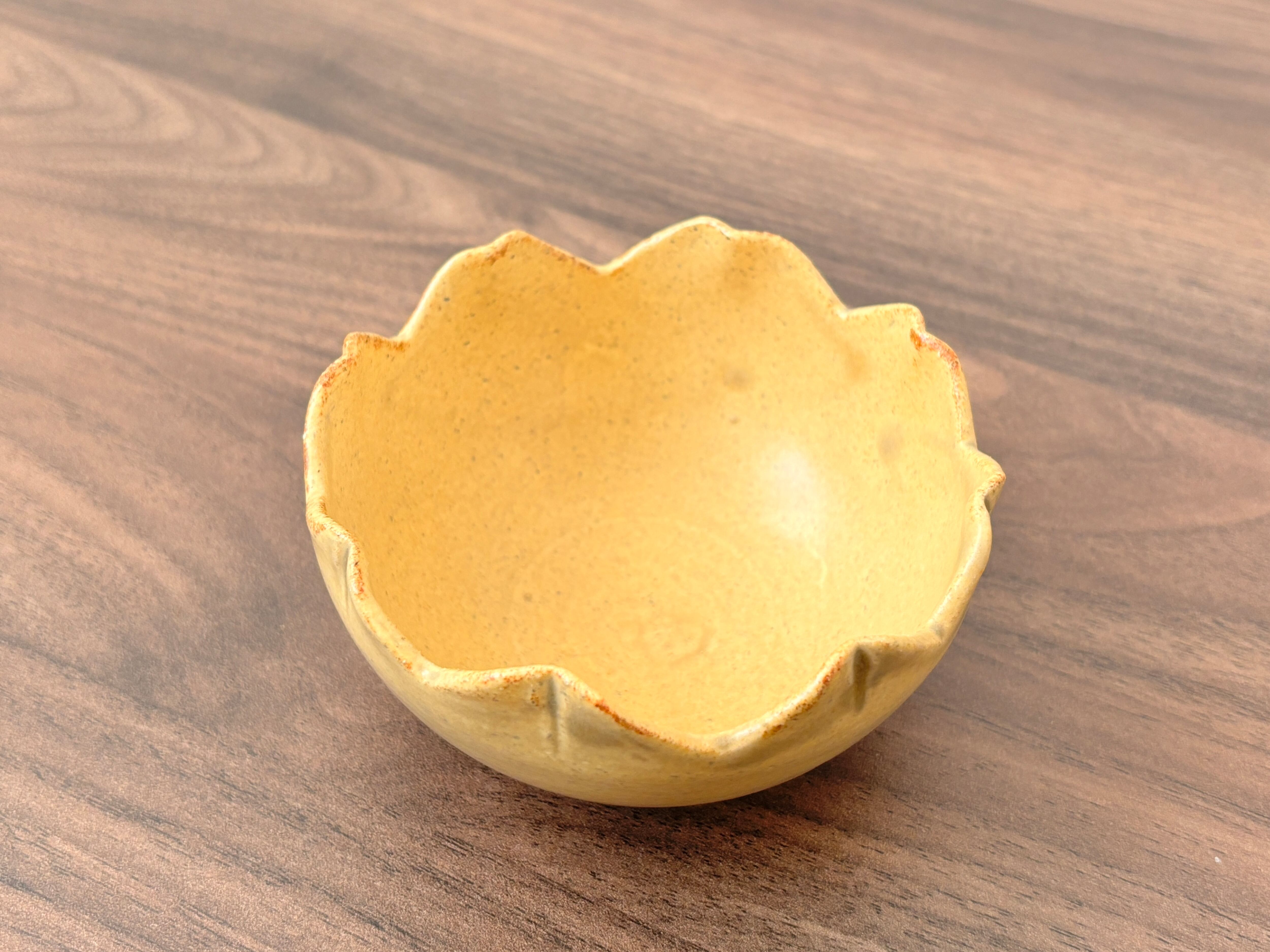 優しい黄色の小鉢は、上から見ると花のように見える形状が特徴の魅力的なアイテムです。この小鉢は、食卓に彩りを添え、心温まるひとときを演出します。