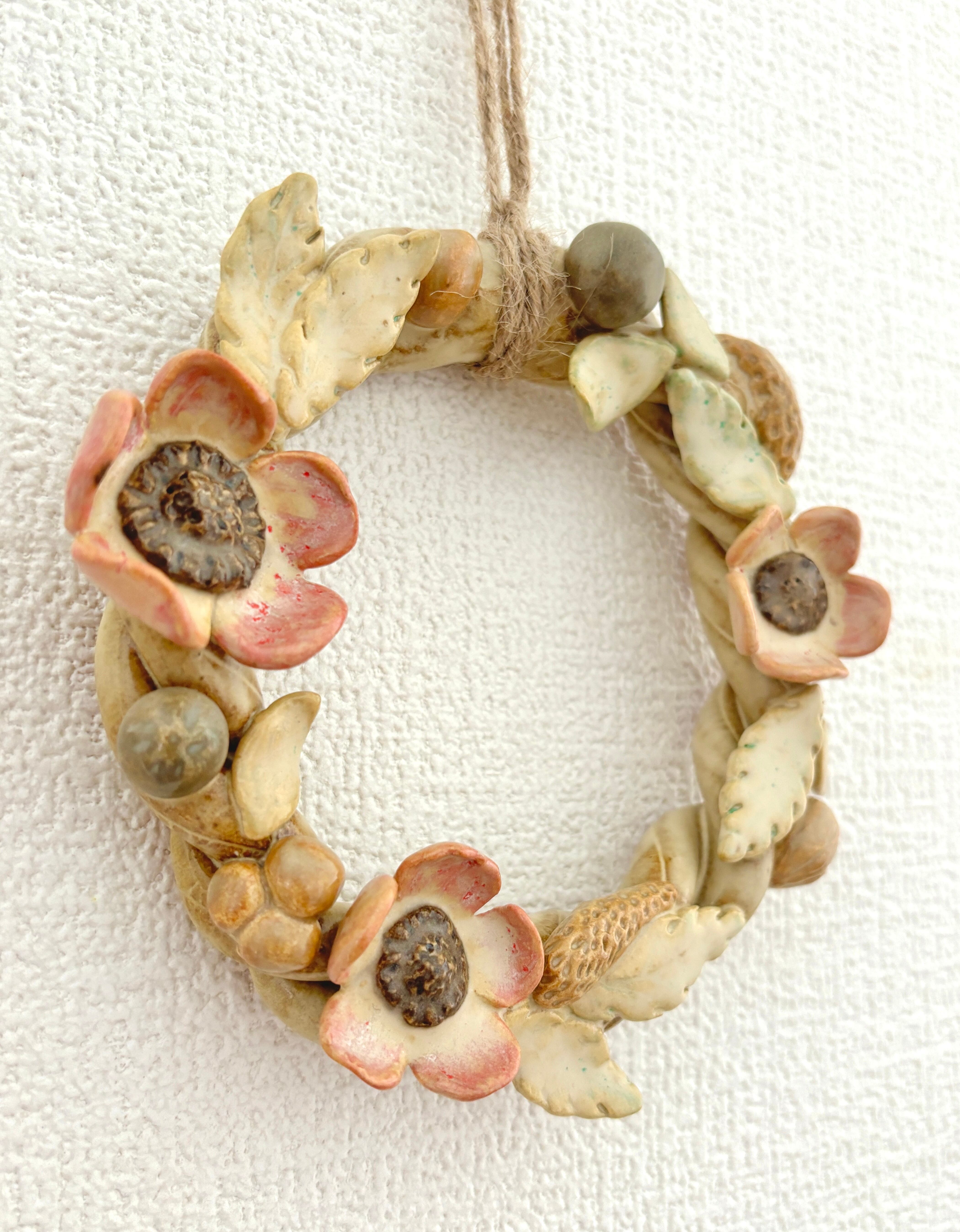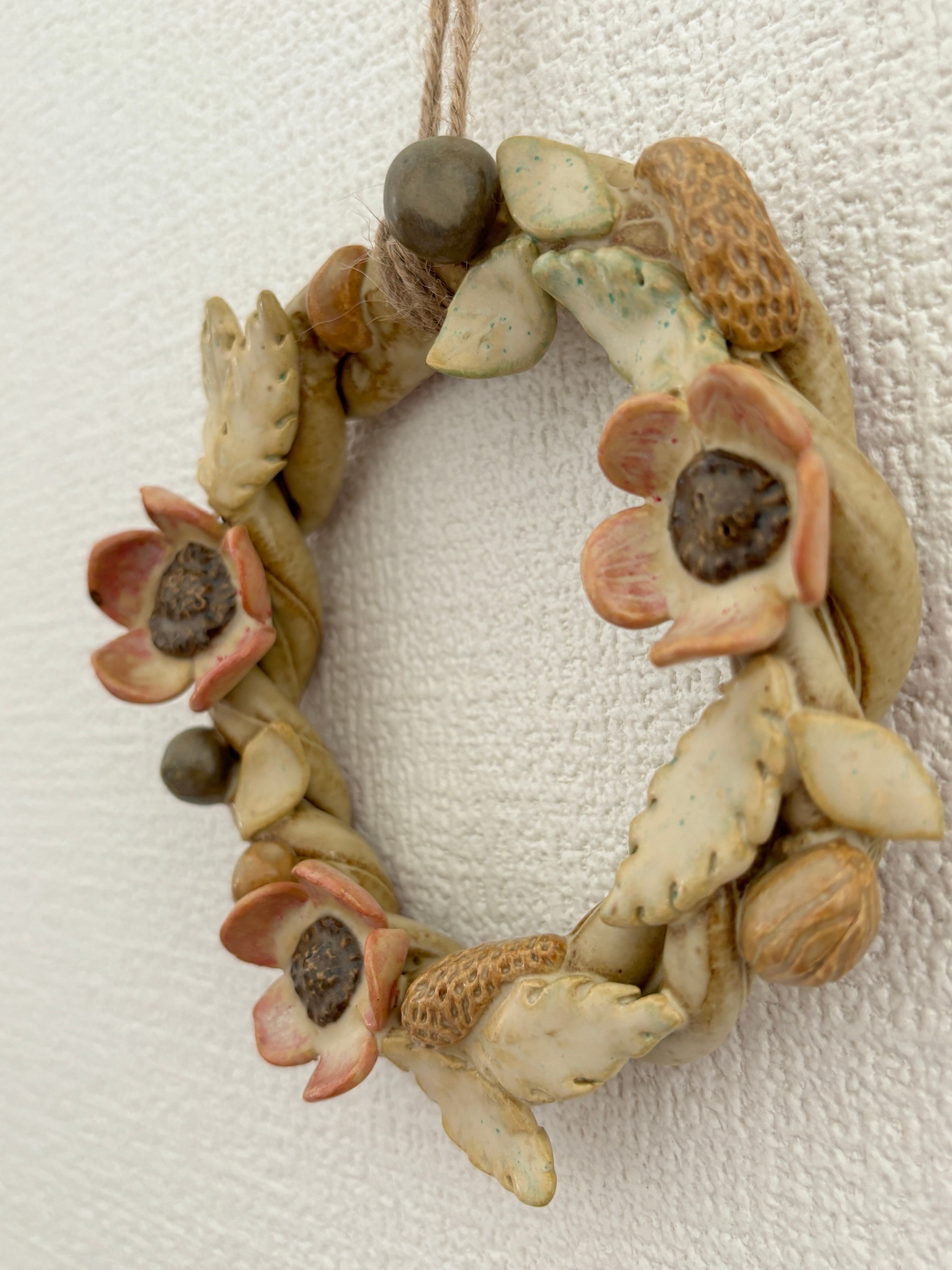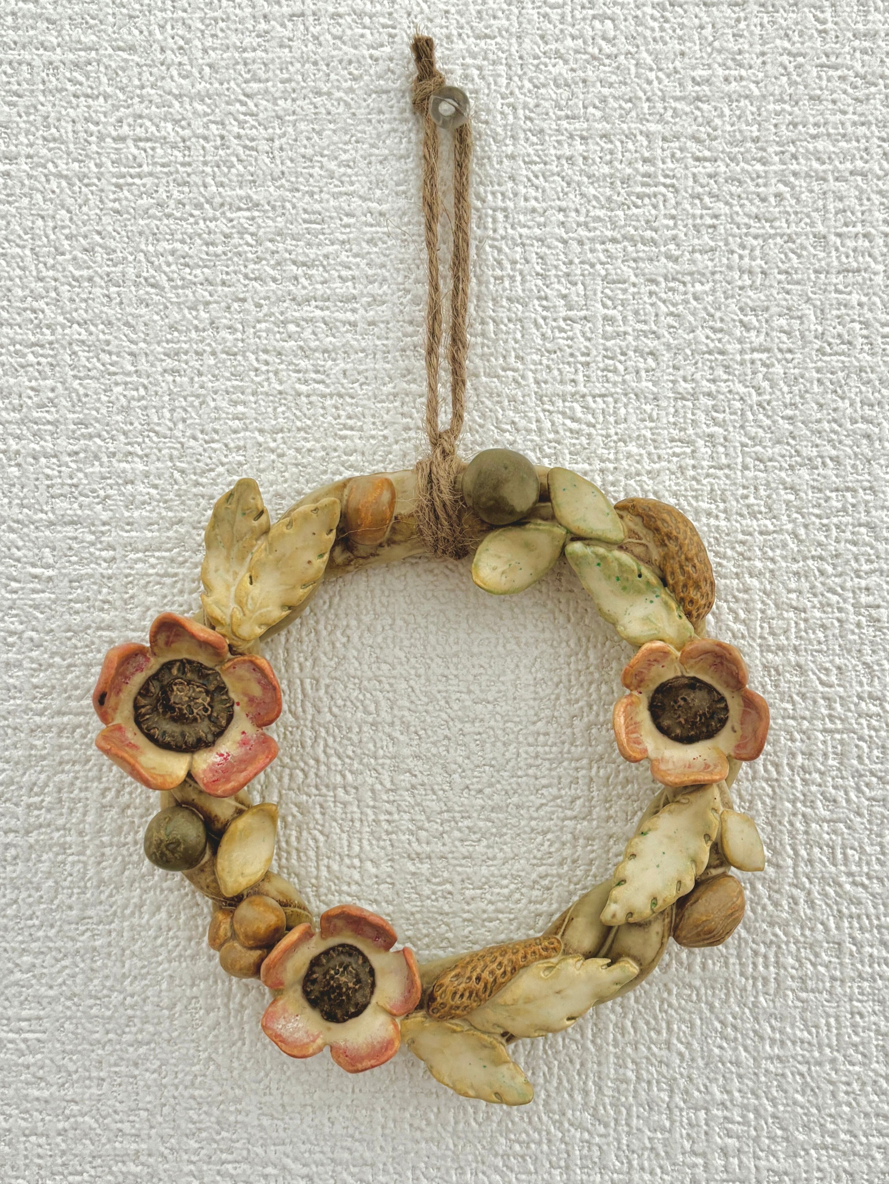 陶器の壁掛けリース 花と木の実